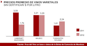 Según datos de la Bolsa de Comercio de Mendoza, el mes pasado el precio promedio de los vinos tintos varietales sin certificar se ubicó casi en el mismo nivel de octubre de 2011, mientras que el promedio de los blancos varietales tuvo un incremento del 35%. El Malbec se pagó durante octubre a un promedio de $3,20 el litro y en el caso del Cabernet Sauvignon se ubicó en $1,74 el litro. Dentro de los varietales blancos, el Torrontés Riojano cotizó en promedio a $2,24 el litro, casi un 40% por encima del mismo mes en 2011.